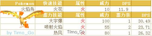 三圣鳥中CP最高的一只,但是尷尬點跟游戲差不多,也就是噴火龍的存在。事實上火焰鳥跟噴火龍的技能幾乎完全一樣,噴火龍還多了一個翅膀攻擊(飛)作為快速技能以及龍爪(龍)作為蓄力技能。