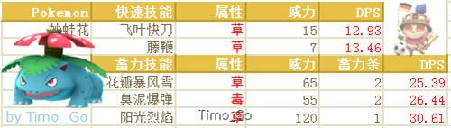 No.15 妙蛙花:草系在御三家中一直人氣普遍偏低,于是Go中索性沒有綠隊……so sad 不過總的來說妙蛙花的技能還是相當不錯的,無論隨即到哪個技能都湊合能用。