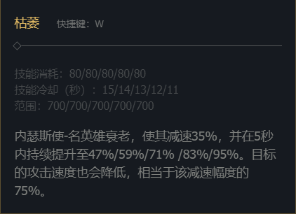 2、W技能是讓一個英雄持續(xù)減速,并且基于減速幅度降低目標的攻擊速度。