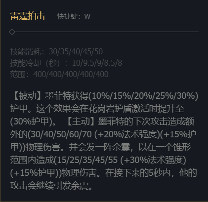 3、W技能,被動是獲得一層護甲,主動釋放時強化石頭人的下一次攻擊并讓他的攻擊帶上余震效果。