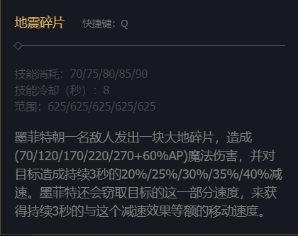 1、石頭人技能主Q副E,Q技能是對一名敵人扔出大地碎片,對敵人造成魔法傷害并減速,敵人減的速會加到石頭人身上。