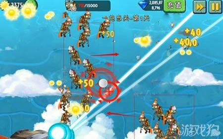 玩法:使用艦載大炮擊殺僵尸達成指定分數即通關。大炮有三種類型可選,分別是單發、激光和導彈群,每次發射需要消耗不同數量的陽光。擊殺不同僵尸種類可以獲得不同數量的陽光。陽光用完游戲就結束了!