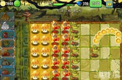 本關就會開始出現太陽傘僵尸,不過跟我這陣容沒什么關系就是了,不帶投擲植物,植物的選擇就如上圖所示,前期的話就是拿土豆什么的過度一下就好了,還是一樣的多種黃金葉,陽光就會很充足!