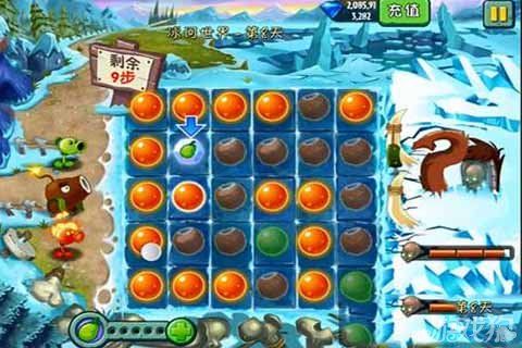 植物大戰僵尸2冰河世界第8天消除玩法技巧,來到這一關你會發現有驚喜在等著你哦,這是新地圖里面新增加的玩法,看見下面的畫面你應該可以猜到,沒錯,就是結合了攻擊僵尸元素的消消樂,是不是很新奇呢,讓我們一起來看植物大戰僵尸2冰河世界第8天消除玩法技巧。