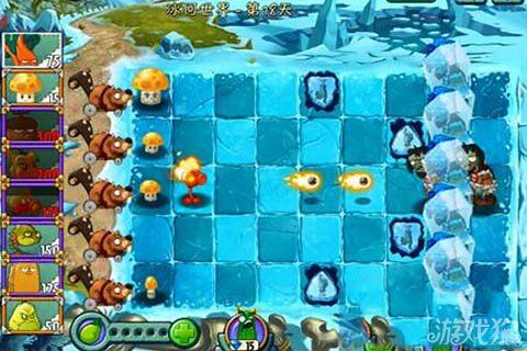 開始的時候不要急著種遠程攻擊性植物,因為前面被冰凍著的僵尸如果過早的解凍會比較麻煩的,所以我們等第一個僵尸過了之后再種。