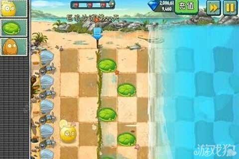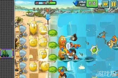 由于被章魚僵尸牽制太緊,導(dǎo)致貝殼僵尸出來的時(shí)候沒有攻擊植物,這個(gè)時(shí)候要牽制,無限種蓮葉,無限種堅(jiān)果,等待傳送帶給我們帶來檸檬。