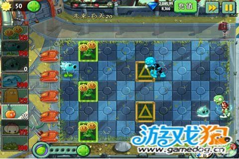 植物大戰僵尸2二十天的時候會有三個綠色的瓷磚,可以選擇把寒冰種在上面,也可以來種太陽花,這樣前期用能量豆的時候就會產生的太陽多,當前面來幾個僵尸的時候可以用植物來對付它們。不要因為前面幾個而破壞了陣型。