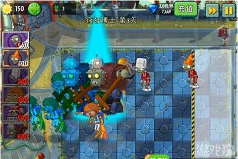 植物大戰僵尸2未來世界瘋狂博士第三天圖文攻略,看出來這關和之前的區別了沒,警戒線靠后了,意味著我們的難度更大,需要從那邊走過來,要經歷更長時間的攻擊,那么首先要觀察有哪些植物,這些植物的攻擊技能是什么,什么樣的僵尸比較適合來躲避。前面放什么后面放什么都是要有計劃的。