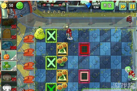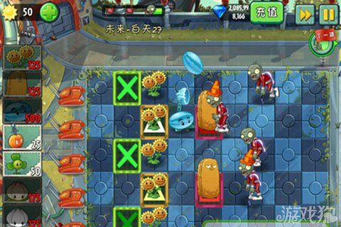 植物大戰(zhàn)僵尸2未來世界第二十七天三星攻略,首先當(dāng)然是向日葵優(yōu)先了,不過這次種在第三排的位置,是需要里面的兩個(gè)黃色瓷磚,有人可能會問為什么不種在倒數(shù)第二排呢,不是也有瓷磚么,但是只是需要兩個(gè)就夠了,三個(gè)還是留給攻擊的植物比較劃算。兩個(gè)的時(shí)候?yàn)榱嗣烙^就放在一排啦。
