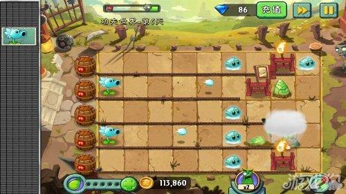 大家要注意了不要讓僵尸噴到炸藥桶,這一關是傳送帶模式,前面幾個植物是免費的寒冰射手。寒冰豆子用來消滅火把僵尸,這一關火把僵尸非常討厭。