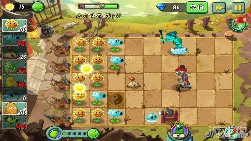按照國際慣例,開始重向日葵。第一個僵尸出現(xiàn)用土豆地雷來炸掉。輸出主力依然是雪花豌豆,既能減速還有很高的傷害能力。