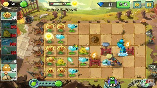 國際慣例,開局開始種向日葵。在武器臺的中間放上冰西瓜。僵尸走過去的時候能夠凍住。