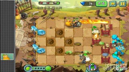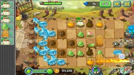這關又是很簡單的傳送帶模式。種上火葫蘆的時候記得要點擊它才會噴火噢。最后一排種上冰西瓜來攻擊僵尸。前面種上高堅果來保護。竹筍緊跟其后。順便在種上能夠加血的奶媽—仙桃。