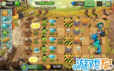 第一波僵尸:中間那波僵尸還是算比較簡單,在向日葵附近都要種植堅果,每一排都要,配合后面的雙重射手和寒冰射手,如果這一排非常多的僵尸就使用寒冰射手的大招!基本上可以守住。