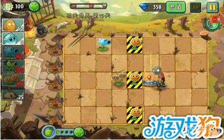 游戲的開始:開局用很經典的布陣!土豆雷炸死前面出的單個僵尸,同時要在最后列種植雙胞向日葵。