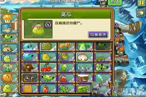 上圖左邊是已經(jīng)選擇的植物,其中陽(yáng)光菇、雙重射手、土豆雷、窩瓜、激光豆是比較重要的。