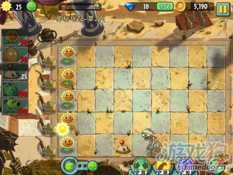 多了個鐵桶僵尸比較難打一點,不過給的能量豆很厲害。開始的首先任務當然就是種太陽啦,出來的第一個僵尸可以種個土豆雷來消滅它。
