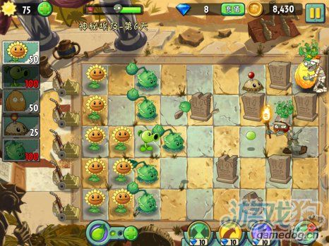 最新出現的火炬僵尸速度比較快,兩個植物才能消滅它。每關的首要任務都是種植太陽,出來的第一關僵尸可以在后方種土豆雷來消滅它。