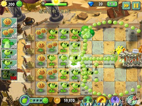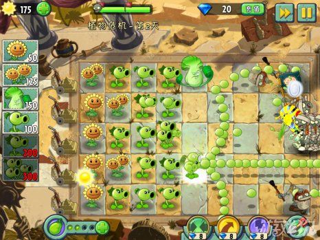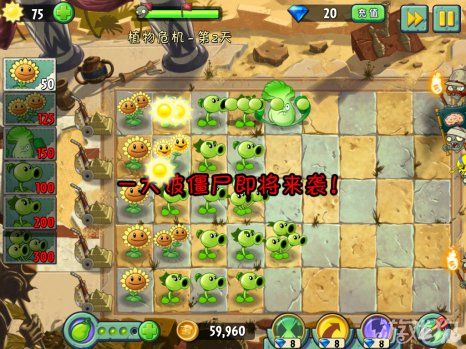 依舊是用系統給定的植物來消滅僵尸。開始種向日葵,僵尸出來了只有選擇100的豌豆射手來消滅它。