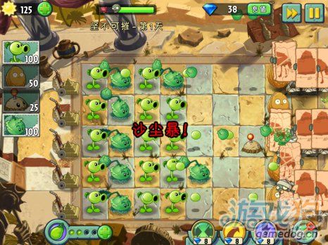 植物大戰(zhàn)僵尸2神秘埃及堅(jiān)不可摧第1天攻略,這關(guān)沒(méi)有太陽(yáng)花,出場(chǎng)的時(shí)候總共給了3250個(gè)太陽(yáng),你需要的就是利用這些有限的太陽(yáng)去消滅所有的僵尸。首先,我們把包菜投手和豌豆射手種在后面,前面種上堅(jiān)果。