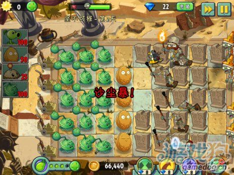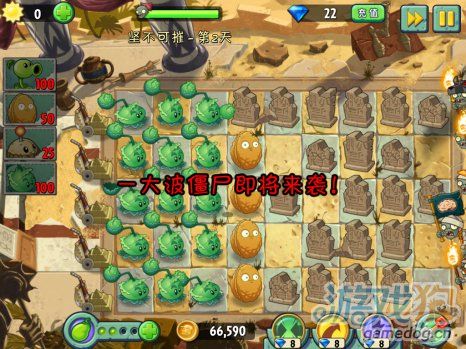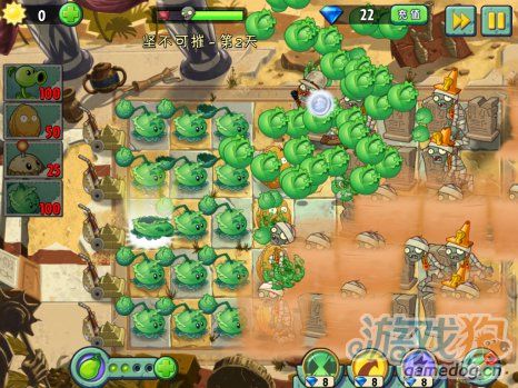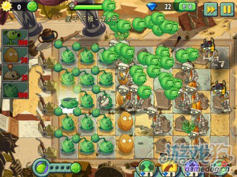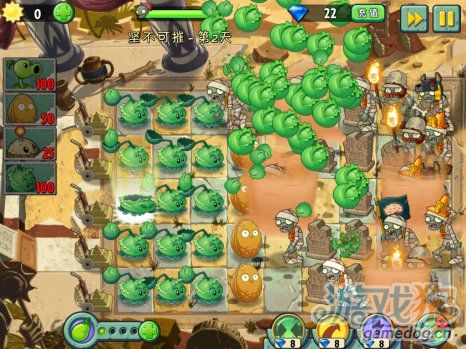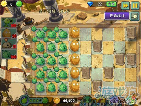 植物大戰(zhàn)僵尸2神秘埃及堅(jiān)不可摧第2天攻略,這一關(guān)的玩法也是你優(yōu)先種好植物然后點(diǎn)擊左上角的開(kāi)始戰(zhàn)斗。在這一關(guān)里墓碑比較多,所以包菜投手會(huì)是一個(gè)很好的選擇。在最后的三排都種上白菜投手,前面種一排的堅(jiān)果來(lái)防御。