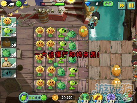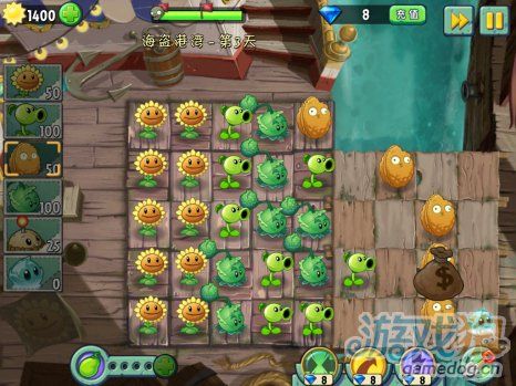 難打的鐵桶僵尸又出來了,能量豆就留著用來對付鐵桶僵尸。在空出來的甲板那塊一定要種上堅(jiān)果防止繩子僵尸躍到后面去吃掉植物。