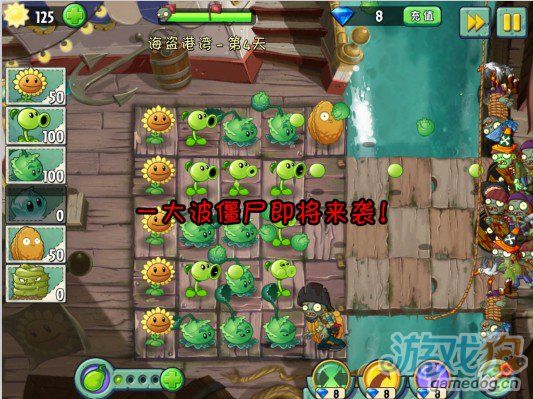 來到了本關的中間點,會有一波很多的僵尸過來,那么要頂住了,僵尸一定會讓你損兵折將的。