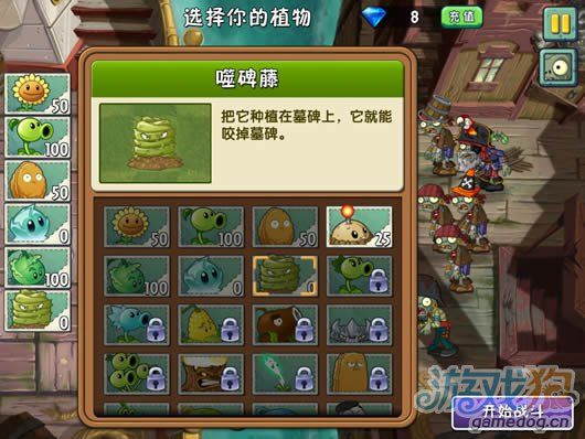 每一關都會出來個新的僵尸,這次出來的駱駝僵尸還是有點難打的。出來的第一關僵尸在墓碑的后面所有需要種個攻擊遠的包菜投手。選擇植物:添……