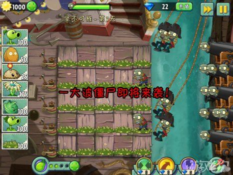 植物大戰僵尸2海盜港灣堅不可摧第3天的具體通關攻略空地上面全種上地刺,不要種什么攻擊的植物。當僵尸走在地刺上的時候,走兩個地刺就會被刺死。