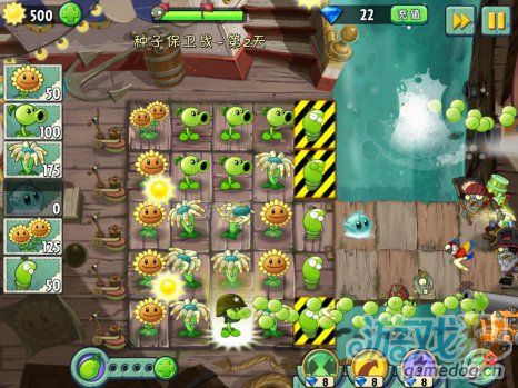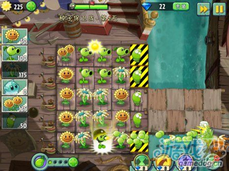 植物大戰僵尸2種子保衛戰第二天圖文攻略這關保護三個警戒線里的彈簧豆不被僵尸吃掉。首先開始種太陽花,中間空著的甲板上也種上彈簧豆。 劇情發展: