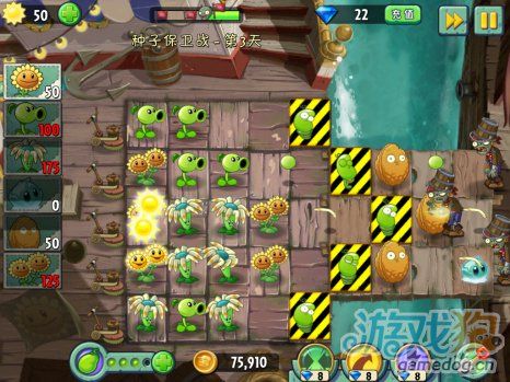 一開始出來的僵尸很少,等把太陽種滿之后,就在僵尸出來的那行種上植物就可以了。地圖中間的空著的甲板那塊須種上一個堅果來抵御僵尸的進攻……