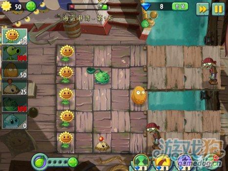 有太陽(yáng)就盡量給甲板上都種滿(mǎn)植物,每行三個(gè)植物是最合適的。必要的時(shí)候可以使用能量豆來(lái)攻擊。