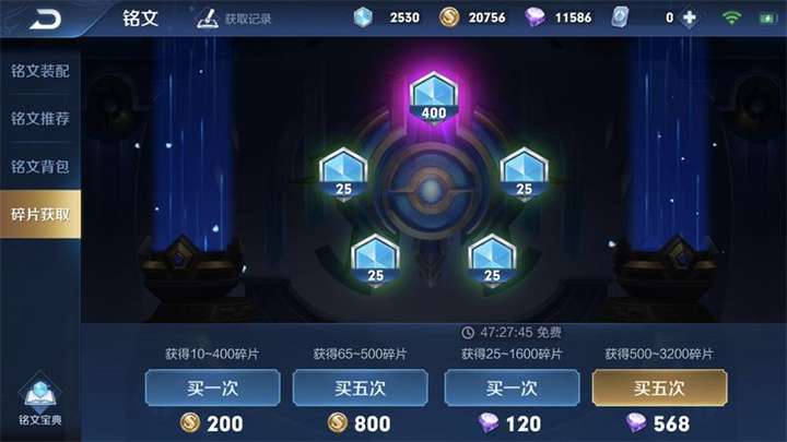 免費/金幣/鉆石抽銘文碎片:每個48個小時可以免費來一發(fā)鉆石抽獎,同時也可以消耗金幣/鉆石來抽獎,五連抽有打折。