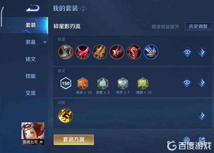 碎星影刃流,出裝:極速戰(zhàn)靴,影刃,無盡戰(zhàn)刃,吸血刀,碎星錘,破軍;銘文:10禍源,3隱匿,7奪萃,10鷹眼。這套套裝的成型速度快而且傷害非常高,到了大后期碎星錘可換成破曉,打坦克更容易。