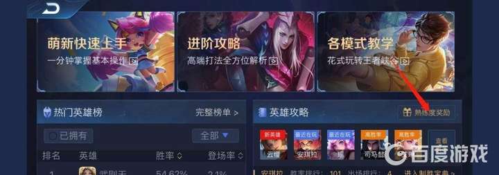 王者熟練度獎勵領取位置:點擊進入對戰,選擇模式頁面點擊進入實戰寶典,點擊英雄攻略旁邊的熟練度獎勵,進入微社區游戲數據頁面后,在英雄池左側點擊英雄熟練度寶箱即可領取獎勵了。