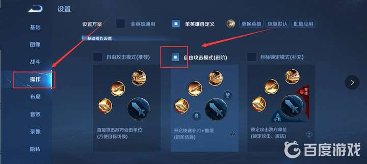 2、點擊設置頁面的【操作】,在基礎操作設置中勾選“自由攻擊模式(進階)”。