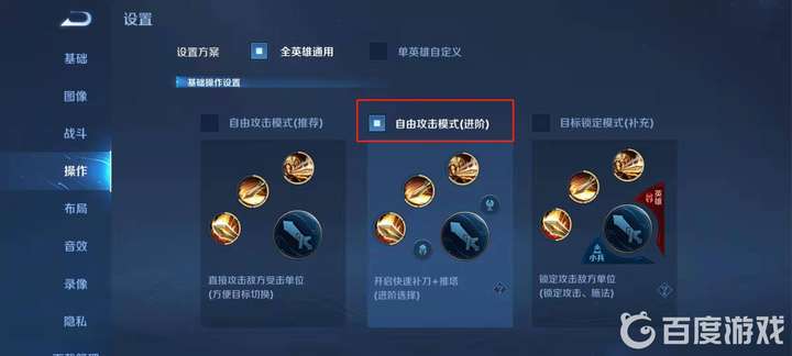 1、自由攻擊模式是玩家最喜歡的操作模式,設置了之后,推塔補刀的時候非常實用,避免了想去打塔卻是打在了敵方英雄身上致使自己被防御塔攻擊。