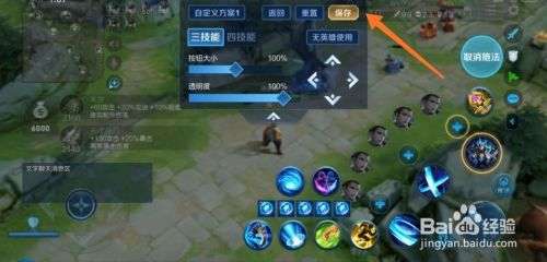 5 進入自定義布局界面后,拖動所有按鍵到合適的位置,另外可以單獨設置三技能和四技能的按鈕大小和透明度,一共可以設置4套按鍵位置,需要的點擊自定義方案,設置不理想可以點擊重置,設置完后點擊保存。