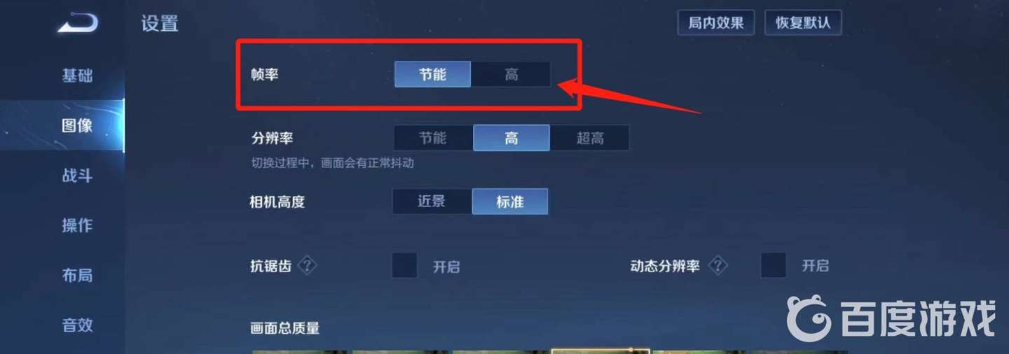 3、在幀率設(shè)置這里,節(jié)能幀率為60幀率,高幀率代表120幀,將光標(biāo)滑動至高。