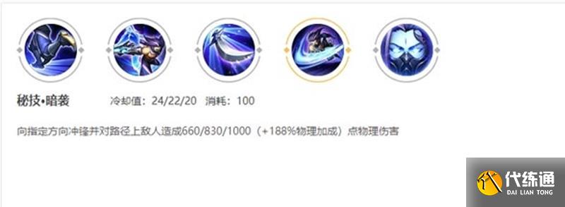 解析:向一個方向進行沖鋒,對路徑上的敵人造成傷害,且可以過墻。這個技能讓蘭陵王擁有極強的切入能力,是突襲脆皮的利器