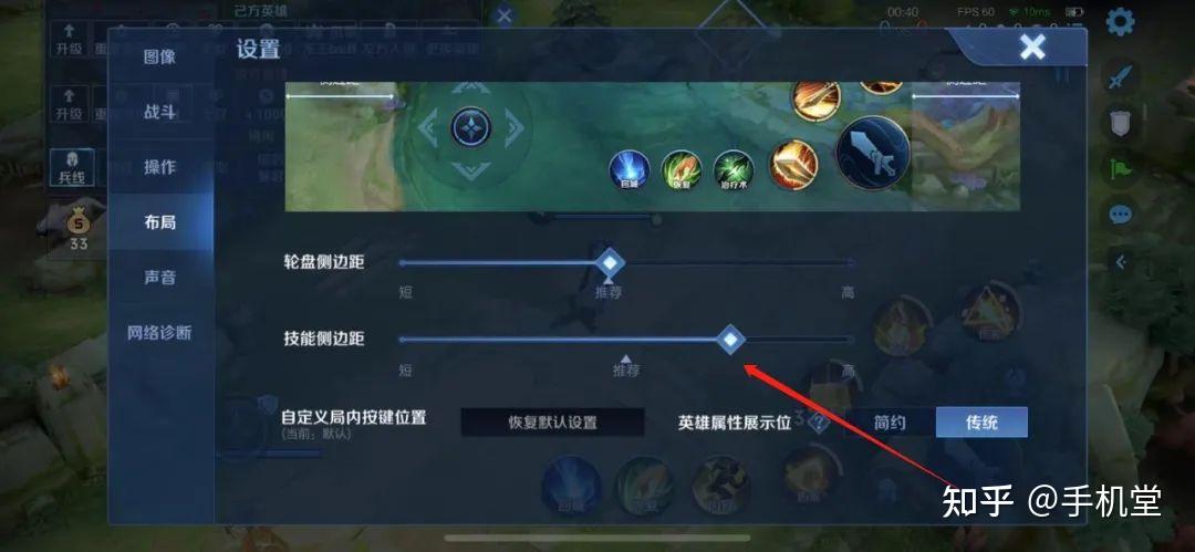 我們只需要更改游戲設置-布局-側邊欄技能-向“高”這邊調整一半的距離,根據自己手掌大小設置即可。
