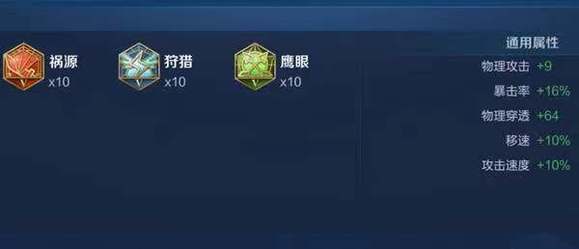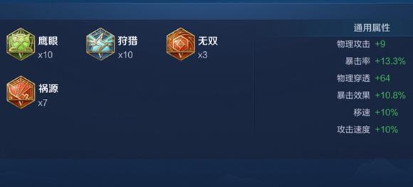 銘文搭配需注重暴擊與穿透的協同效應。10禍源提供16%暴擊率,彌補無盡戰刃成型前的輸出真空期;10鷹眼的64物理穿透顯著提升對坦克的威脅;10狩獵的移速與攻速優化追擊與普攻手感。若追求極致爆發,可將部分禍源替換為無雙銘文,但需承擔前期暴擊穩定性下降的風險。