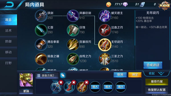 中期裝備選擇的豐富性相比于前期來(lái)說(shuō)就大大的提高了,尤其是在版本更新后又出了幾件新裝備,讓玩家可以根據(jù)場(chǎng)上局勢(shì)進(jìn)行靈活的選擇。作為戰(zhàn)士時(shí),中期裝備第一件推薦選擇破甲弓,提高一下自身的攻擊力,而且雅典娜一技能和三技能的護(hù)盾都有物理加成,這樣也可以提高護(hù)盾所能抵擋的傷害。第二件裝備則推薦出冷靜之靴,增加移速的同時(shí)還能縮減技能CD,對(duì)于雅典娜這種需要頻繁釋放技能來(lái)進(jìn)行作戰(zhàn)的英雄十分適合,當(dāng)然如果在對(duì)面刺客物理類英雄很多時(shí)也可以選擇出抵抗之靴,減少普通攻擊受到的傷害。第三件裝備則推薦選擇無(wú)盡戰(zhàn)刃,大幅提高自身攻擊力和暴擊率,可以讓雅典娜的爆發(fā)力顯著提高,在短時(shí)間運(yùn)用技能連招打出高額傷害。
