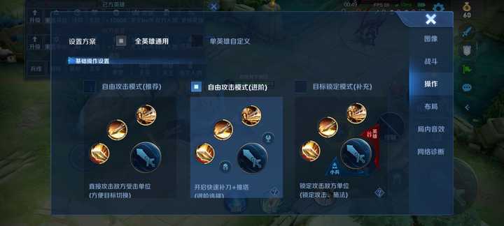 而選擇第二種“進階”自由攻擊模式,適合射手等物理攻擊職業,可以自己決定是打小兵、打塔還是攻擊對面英雄了,也是比較常用的設置。(如下圖)