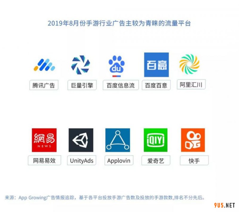 二、手游買量渠道概覽以各流量平臺(tái)廣告的游戲數(shù)量及游戲廣告數(shù)等因素綜合分析,梳理出以下游戲廣告主較為青睞的流量平臺(tái),短視頻平臺(tái)快手也名列其中。(排名不分先后)