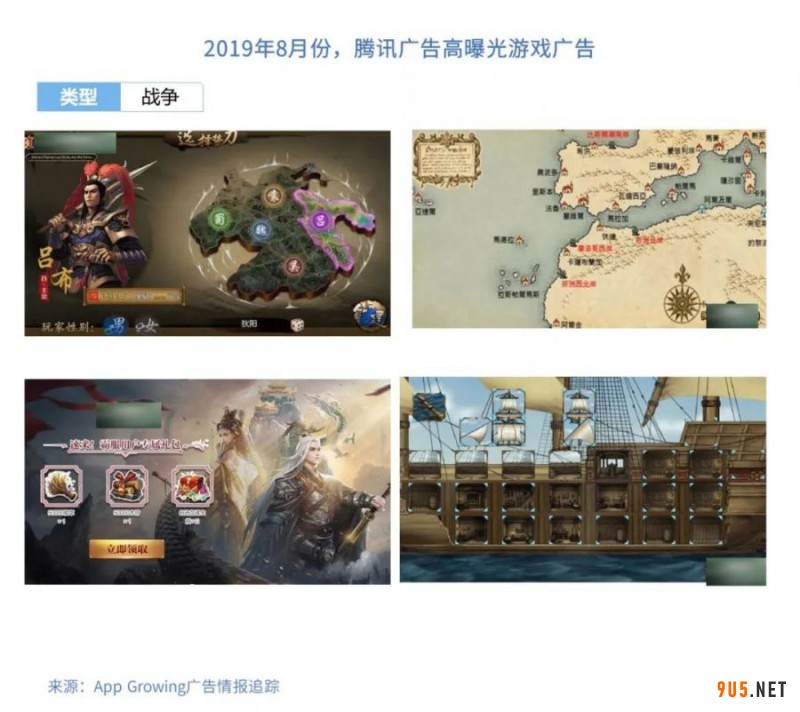六、8月份高曝光游戲廣告素材盤點(diǎn)基于App Growing所追蹤的廣告數(shù)據(jù),結(jié)合算法及機(jī)器學(xué)習(xí),估算單條廣告的8月份累計(jì)曝光情況,整理出8月份各主流流量平臺(tái)新上線的廣告中累計(jì)高曝光的游戲廣告素材如下。1)騰訊廣告高曝光游戲廣告盤點(diǎn)